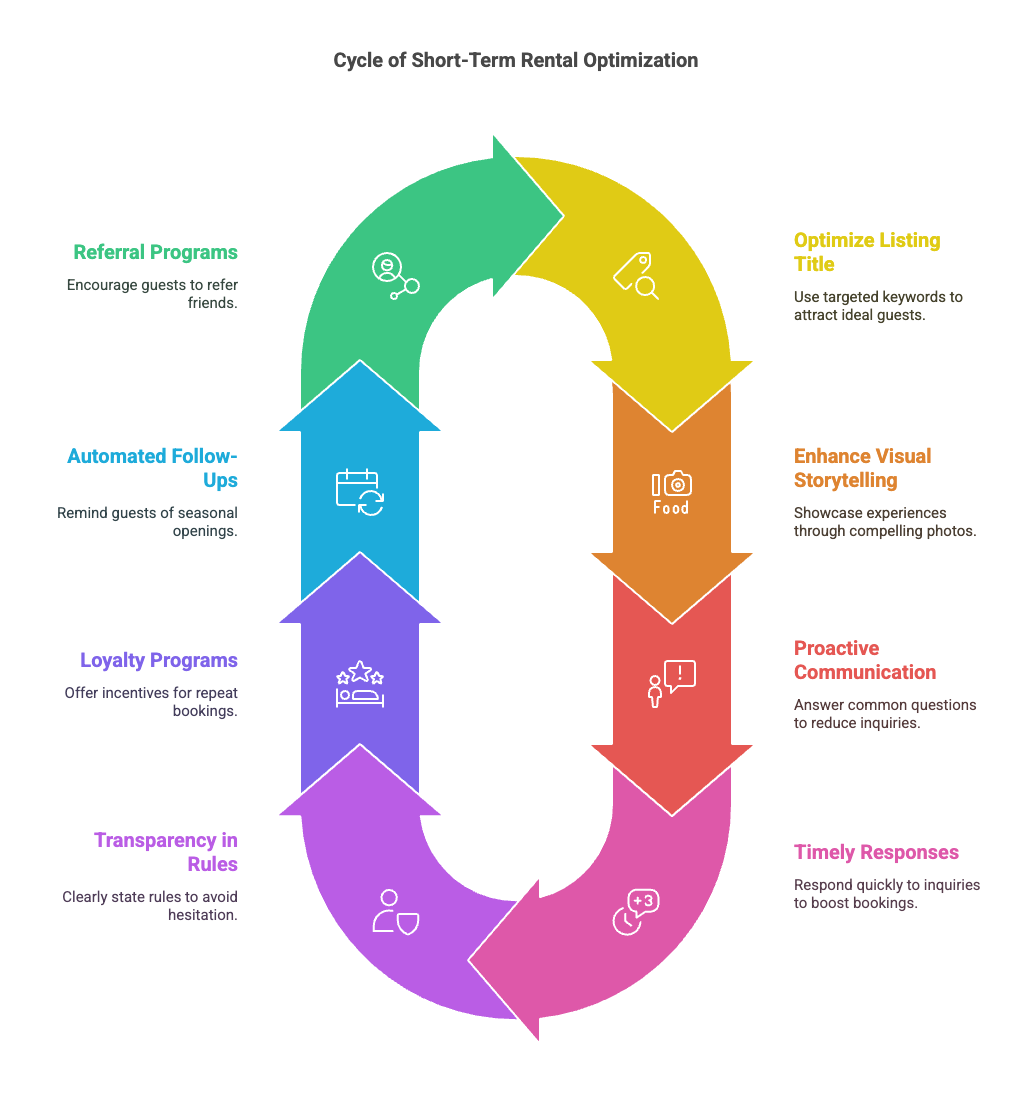 Start by optimizing your listing title with targeted keywords that match your ideal guest's search terms. Generic descriptions like "Cozy 2BR Apartment" won't cut it.
