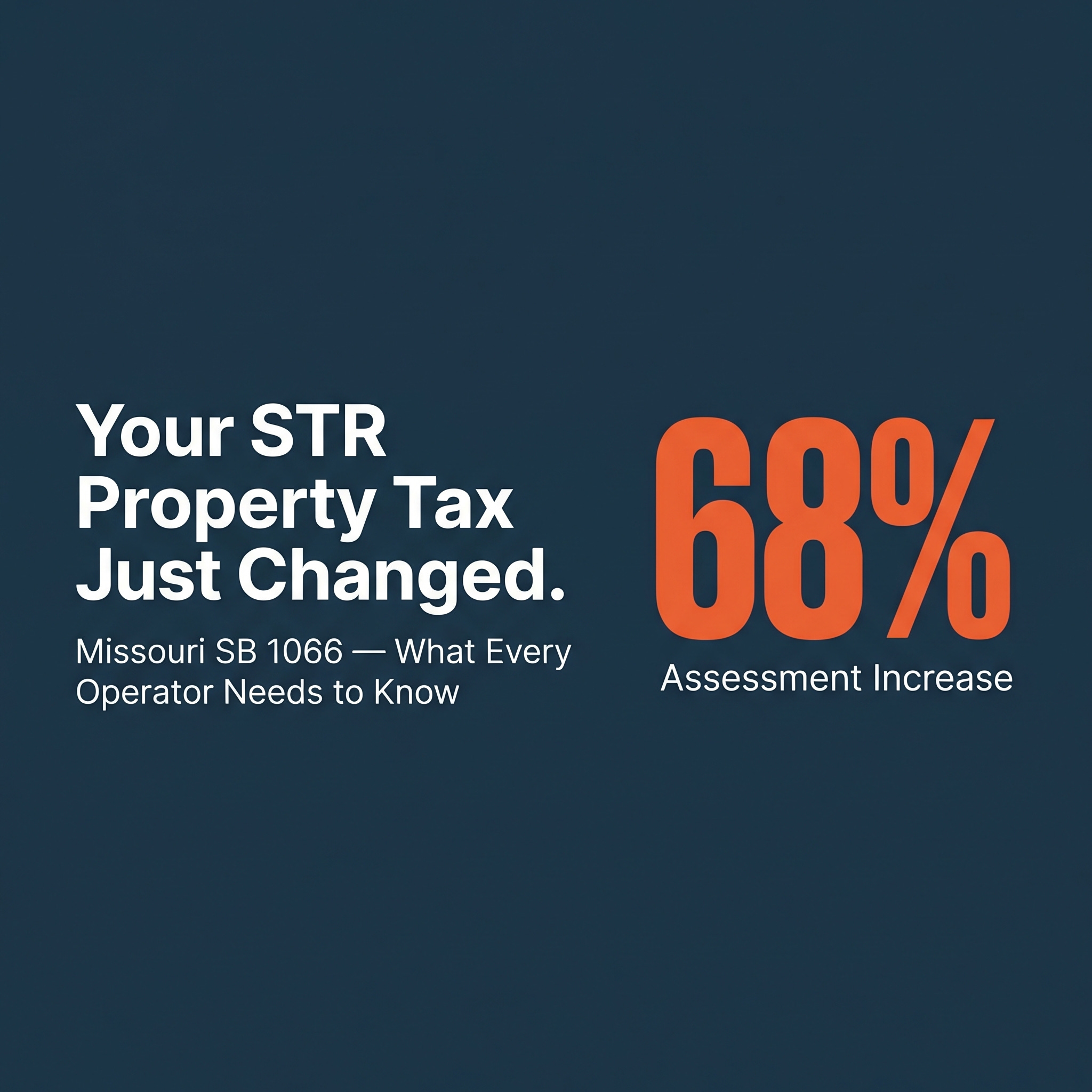 Missouri's SB 1066 passed the Senate 30-3 on March 25, 2026. The House companion bill followed April 2. The legislation reclassifies short-term rental properties from residential (assessed at 19% of appraised value) to commercial (assessed at 32%). That's a 68% jump in your assessment ratio — before anyone applies a millage rate on top.